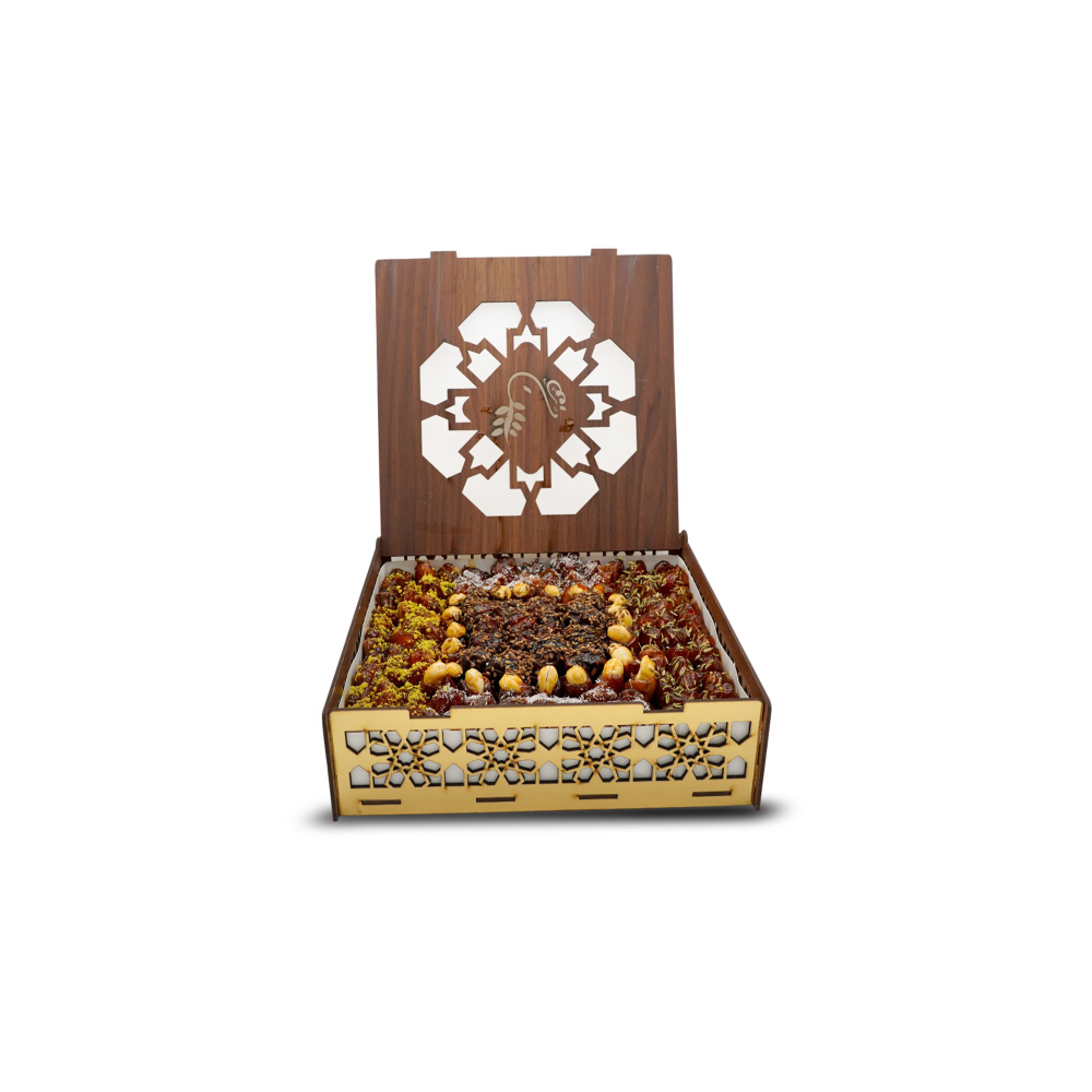 ومغطى بالدبس الذهبي، ومزين بالفستق المبشور، والحلوة الحساوية ذات النكهة الطيبة، والسمسم الحساوي المحمص، وجوز الهند الرقيق.